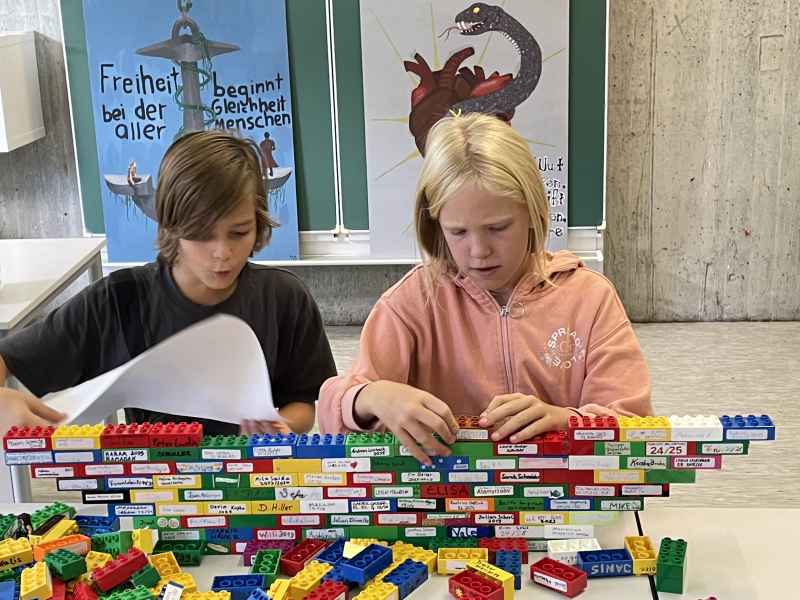 Der Anker steht! Wie jedes wird der Anker zu Beginn des Schuljahres zusammen mit Schülern und Schülerinnen der Jahrgangsstufe 5 aufgeaut. Zusammen mit Frau Bermansder und Herrn Laupp haben Nele (5a), Patrick (5b), Marielena (5b) und Jona (5a) den Anker aufgebaut. Es ist ein richtig schöner Anker aus all den vielen, bunt gestalteten Duplosteinen entstanden!