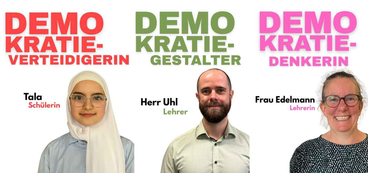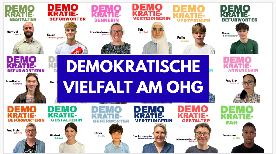 Dazu haben wir ein interaktives Quiz entwickelt, mit dem jede Person herausfinden konnte, welchem Demokratietyp sie am ehesten entspricht. Unsere Collage visualisiert die vielfältigen Ergebnisse: Schülerinnen und Schüler, Lehrkräfte sowie Mitarbeitende des OHG ordneten sich jeweils einem Typ zu. Ob Demokratiefan, Alltagsdemokratin oder Mitgestalter, jede Haltung zählt und trägt zur Diversität und Lebendigkeit unserer Schule bei. Denn Demokratie lebt vom Mitmachen! Und genau das stärkt unsere Schulgemeinschaft, durch Vielfalt, Respekt und gelebtes Engagement. Direkt unter der Collage folgt eine kurze Erklärung der verschiedenen Demokratietypen, die im Quiz vorkommen. Wenn du selbst herausfinden willst, welcher Typ du bist, findest du den Link ebenfalls unter der Collage.