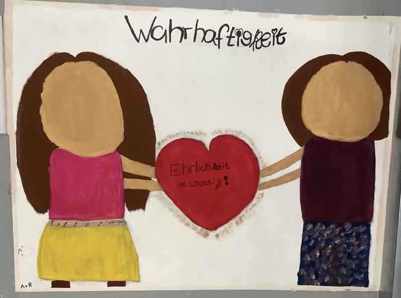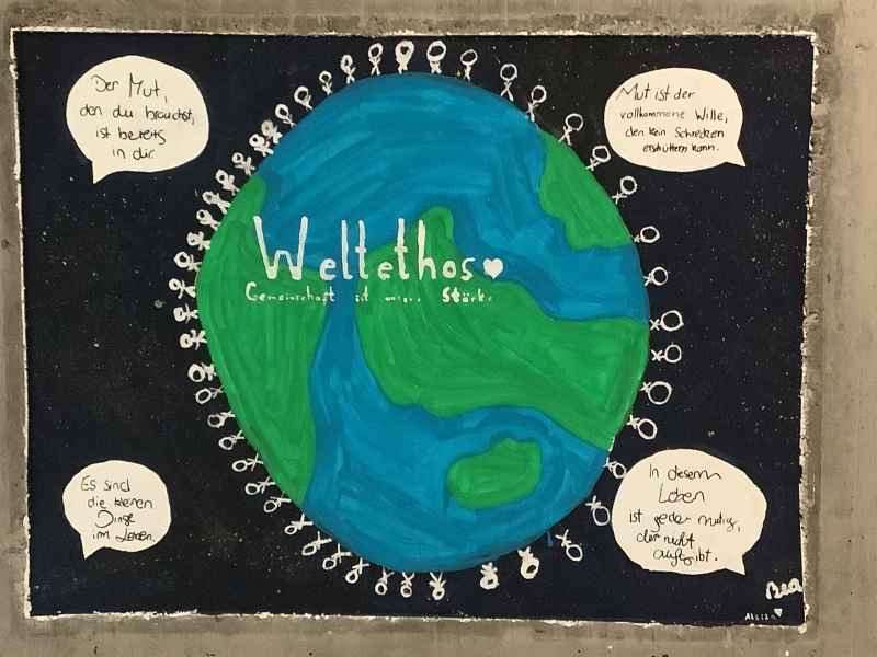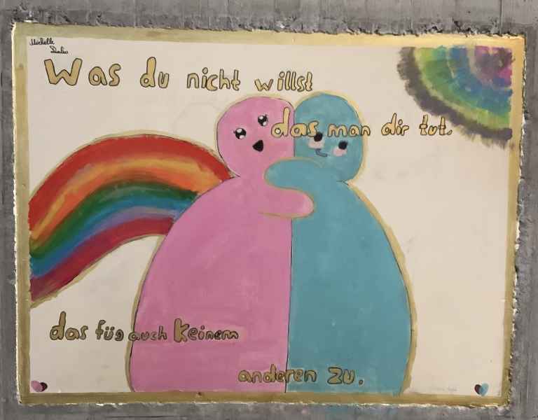 An den Projekttagen zum Thema Demokratie beschäftigte sich eine Gruppe mit den Weltethos-Werten und setzte diese in Bilder um. Diese sind im gesamten Schulhaus nun zu sehen. Die Ergebnisse sind wirklich beeindruckend!