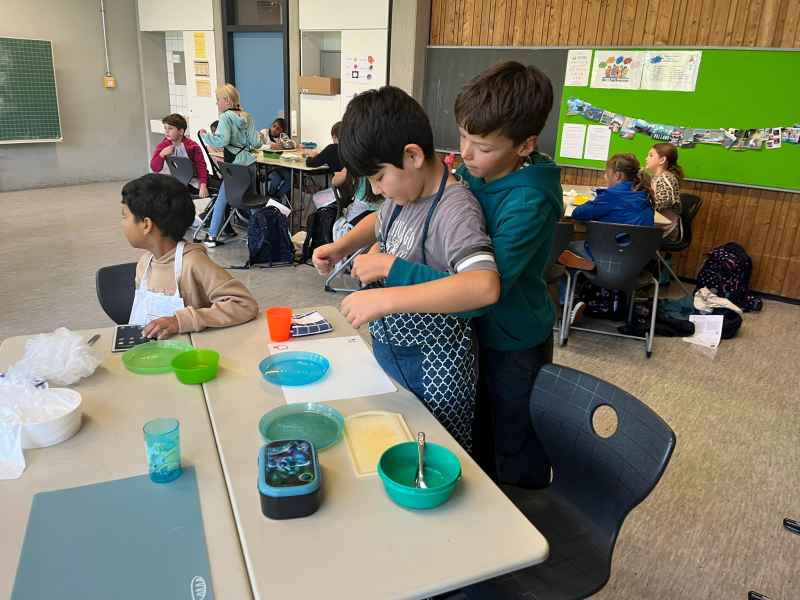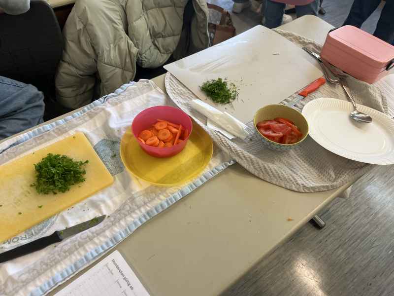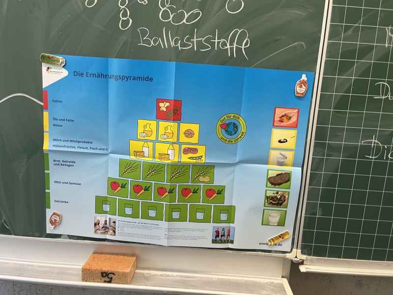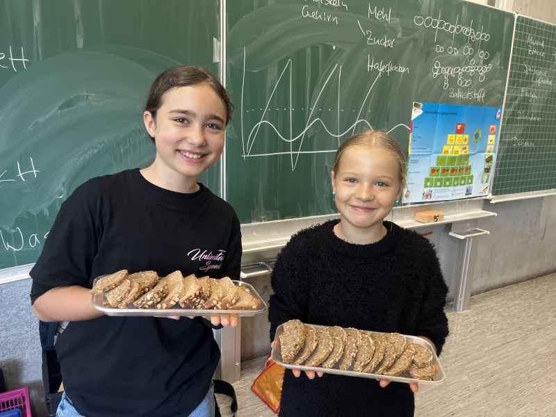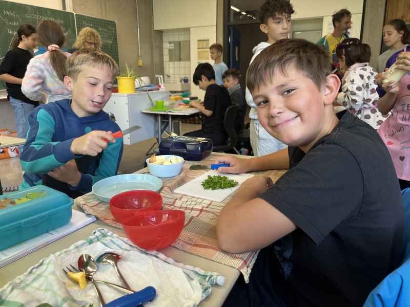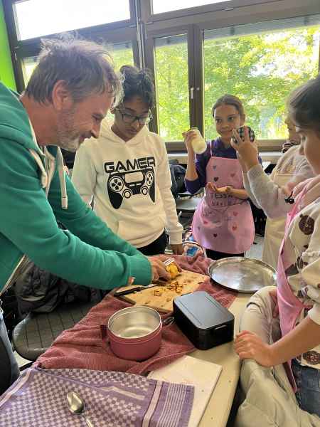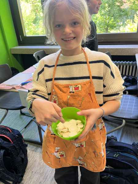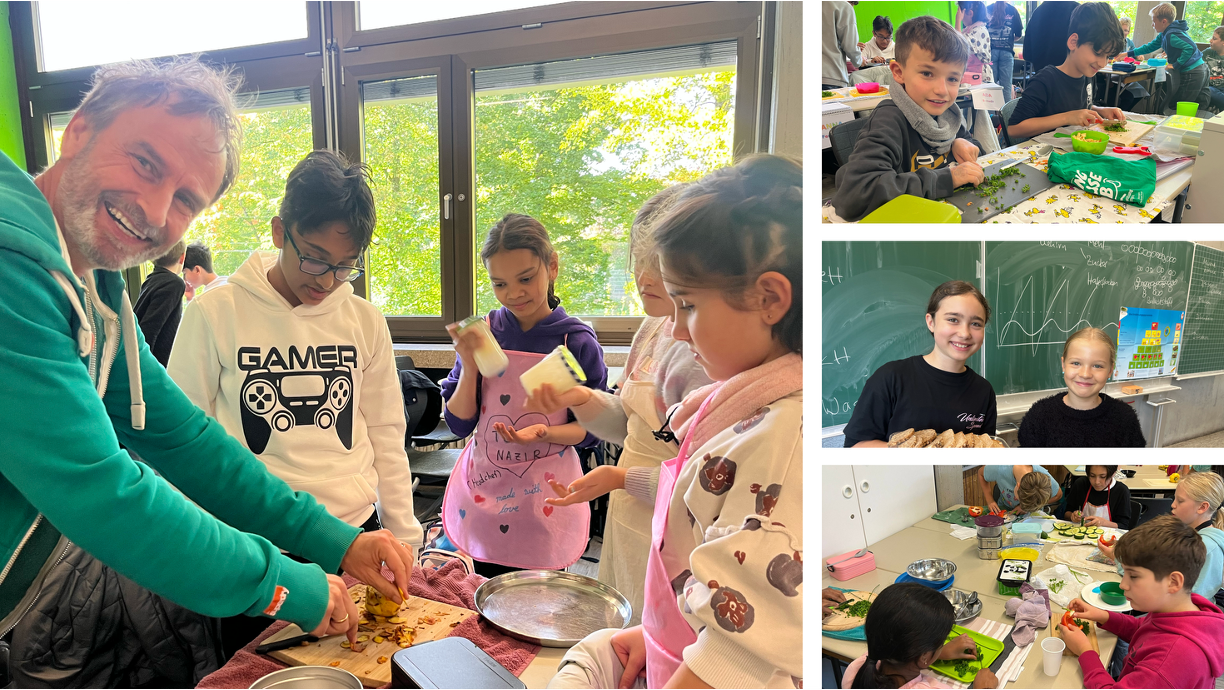 Eine richtig schöne Veranstaltung hatte die Jahrgangsstufe 5 am Mittwoch, dem 8.10.2025. Zunächst wurde gemeinsam erarbeitet, was denn eigentlich gesund ist. Interessant waren die Experimente, die gemacht wurden: So hat man Mehl, Haferflocken und Zucker mit Wasser vermengt und beobachtet, was sich wie schnell auflöst! Dann ging es endlich zum praktischen Teil! Hier wurde fleißig gerührt, geschnippelt und geschnitten!