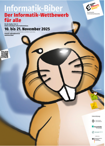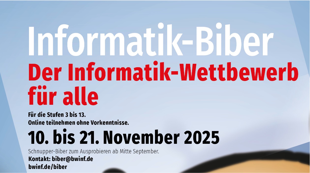 Ab dem 10. November ist es wieder soweit: Zwei Wochen lang sind Biberwochen. An diesem Informatikwettbewerb können alle Schülerinnen und Schüler unserer Schule teilnehmen. Zum Teil werden wir das im Rahmen des Informatikunterrichts, zum Teil auch während anderen Unterrichtstunden stattfinden lassen. Während 35 bzw. 40 min müssen in verschiedenen Altersklassen online Denkaufgaben mit direktem informatischem Hintergrund gelöst werden, die aber auch für Nichtinformatiker lösbar sind. Die Teilnahme ist kostenlos aber nicht umsonst: Es gibt Urkunden und für sehr gute Ergebnisse auch Preise zu gewinnen. Viel Erfolg allen Teilnehmerinnen und Teilnehmern!