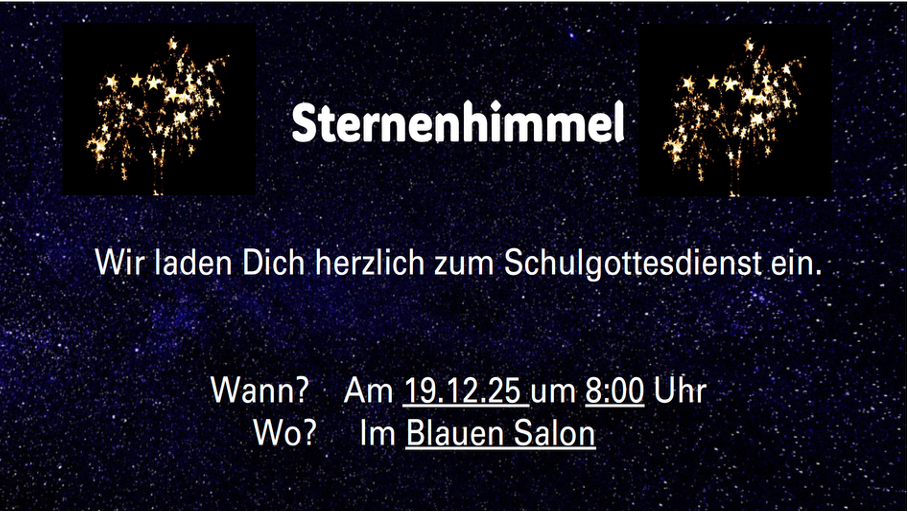 Herzliche Einladung zum Schulgottesdienst am 19.12.2025 um 8.00 Uhr! Im Anschluss an den Schulgottesdienst laden wir zu Gebäck und Punsch ein! Wir freuen uns!