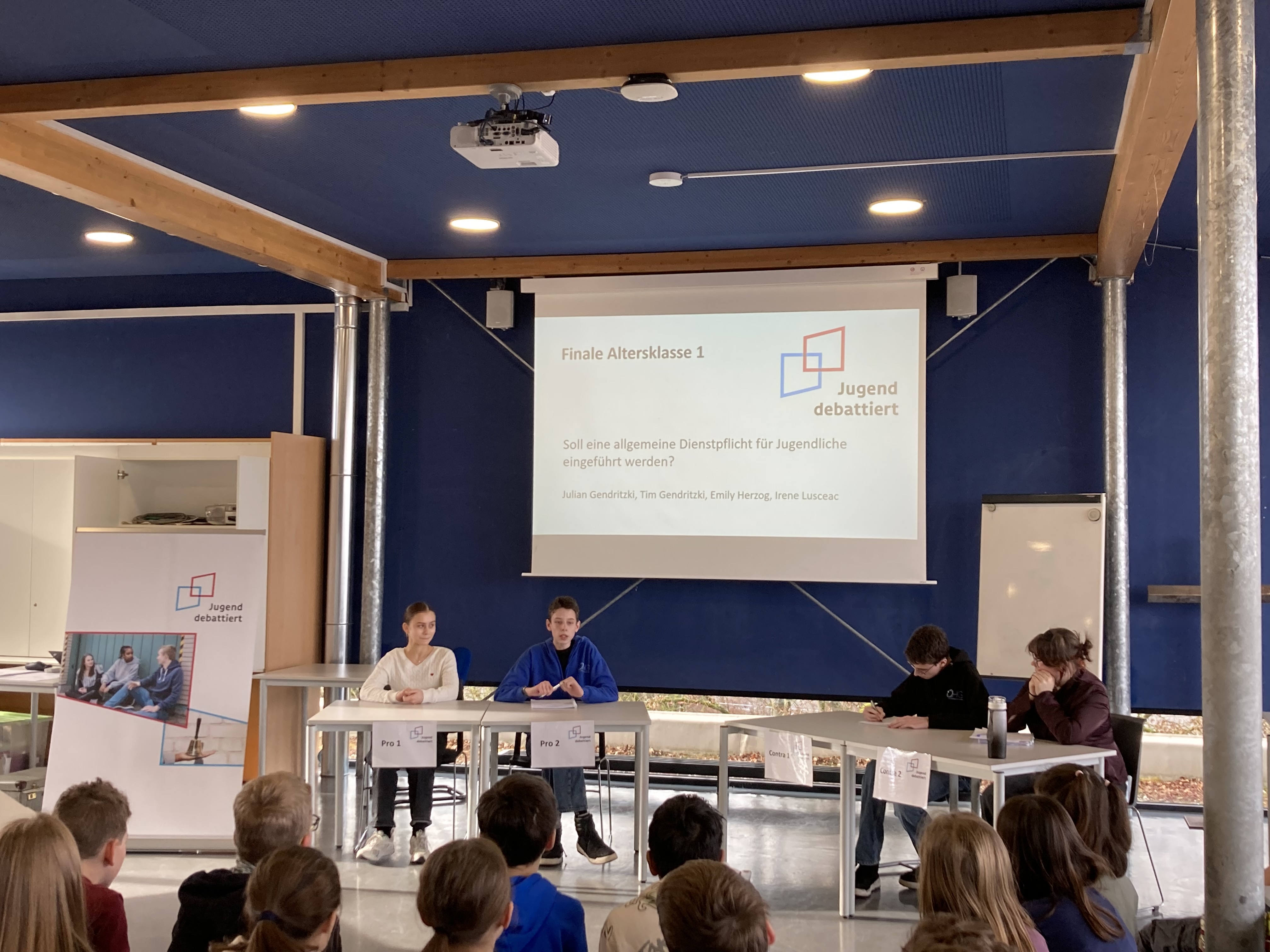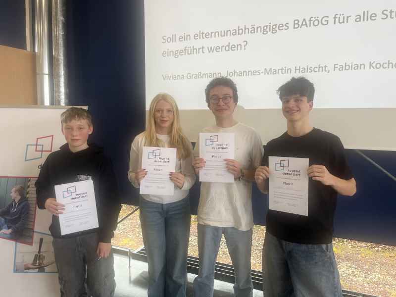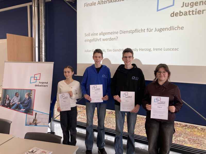 Beim Schulwettbewerb, am 4.2., gewannen in der Altersklasse 1 zum Thema „Soll eine allgemeine Dienstpflicht für Jugendliche eingeführt werden?“ Tim Gentritzki und Julian Gentritzki, in der Altersklasse 2 zum Thema „Soll ein elternunabhängiges Bafög für alle Studierenden eingeführt werden?“ setzten sich Johannes-Martin Haischt, Fabian Kocher und Lukas Schwind durch! Beim Regionalwettbewerb, am 10.2., bei dem zehn Gymnasien aus dem Stuttgarter Umland teilnahmen, überzeugte der Schüler Lukas Schwind und darf nun Ende März das Otto-Hahn-Gymnasium beim Landeswettbewerb in Stuttgart vertreten!
