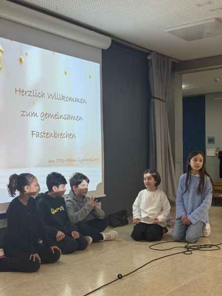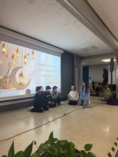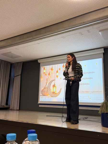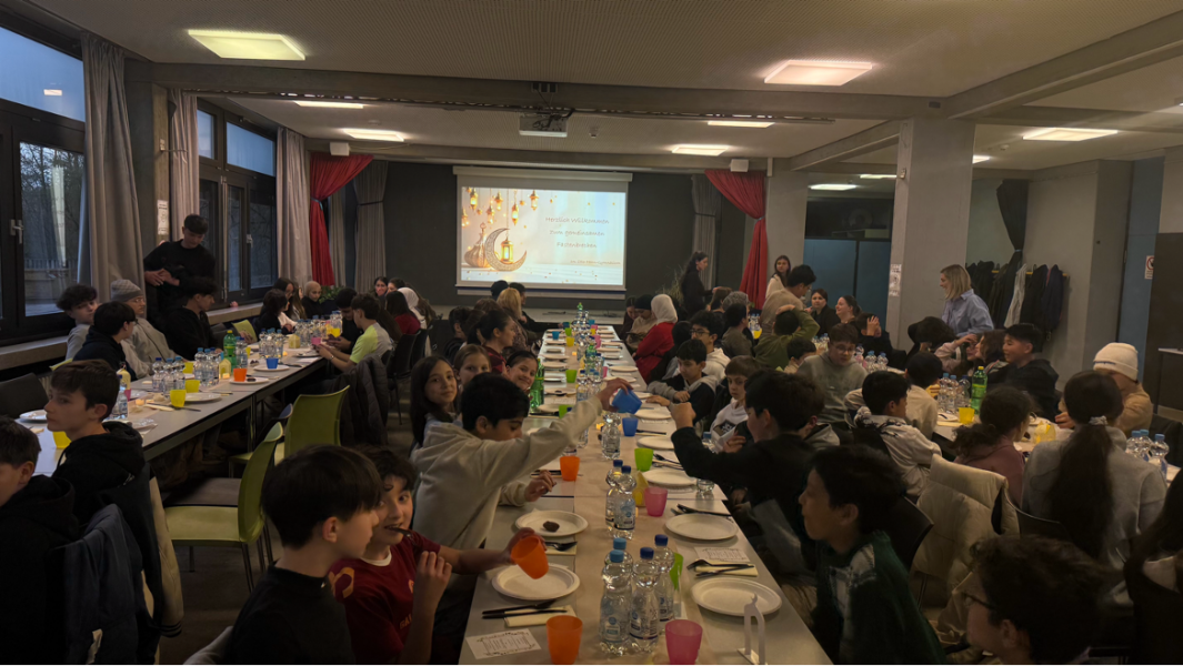 Am Dienstag, den 17. März, fand am Otto-Hahn-Gymnasium ein gemeinsames Fastenbrechen (Iftar) statt. Rund 100 Schülerinnen und Schüler, Lehrkräfte sowie Eltern kamen an diesem Abend zusammen. Zu Beginn wurden die Gäste begrüßt und in den Abend eingeführt. Dabei ging es vor allem darum, einen Einblick in den Ramadan zu geben und den Rahmen für das gemeinsame Fastenbrechen zu setzen. Durch das Programm führten Elif Gergin und Rinora Gijata (Klasse 9, IRU). Sie leiteten die Gäste durch den Abend und gaben den verschiedenen Programmpunkten eine klare Struktur. Ein Teil des Programms war ein Zusammenschnitt von Interviews mit Schülerinnen und Schülern verschiedener Klassenstufen. Darin berichteten sie, wie sie den Ramadan erleben und welche Rolle diese Zeit für sie im Alltag spielt. Im Anschluss folgte ein Rollenspiel, das von Schülerinnen und Schülern der 5. Klasse vorgeführt wurde (Azad Arica, Ada Bahadir, Enar Faruki, Tessa Nazir und Elif Ünlü). In einer alltagsnahen Szene setzten sie sich mit der Frage auseinander, warum Muslime fasten. Kurz vor Sonnenuntergang wurde ein gemeinsames Gebet gesprochen, das von Bartu Bayram und Omar Youssef (Klasse 9, IRU) geleitet wurde. Anschließend trug Eren Çelik (Klasse 6, IRU) den Gebetsruf vor. Mit dem Sonnenuntergang wurde schließlich das Fasten traditionell mit Datteln und Wasser gebrochen. Im Anschluss öffnete das Buffet, und der Abend ging in ein gemeinsames Essen über. Dabei stand vor allem das Miteinander im Mittelpunkt: Es wurde gesprochen, gelacht und der Abend in entspannter Atmosphäre gemeinsam verbracht. Ein herzlicher Dank gilt den Eltern der Schülerinnen und Schüler des islamischen Religionsunterrichts für die zahlreichen Beiträge zum Buffet. Auch einige Restaurants haben den Abend durch Spenden unterstützt. Im Nachhinein wurde von vielen Schülerinnen und Schülern des Otto-Hahn-Gymnasiums zurückgemeldet, wie positiv sie den Abend erlebt haben. Vor allem das gemeinsame Zusammensein und die Atmosphäre blieben in positiver Erinnerung.