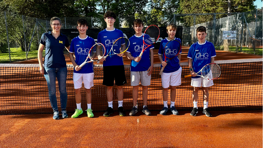Am Montag, den 27. April ging es bei sonnigem frühlingshaften Wetter auf die Tennisanlage des TA VfL Sindelfingen, wo die erste Begegnung zwischen dem Otto-Hahn-Gymnasium Böblingen und dem Gymnasium Unterrieden Sindelfingen anstand. Fürs OHG waren Valentin Greß (8a), Mathis Falk (9b), Patrick Nill (9b), Jonas Wisseler (8b) und Niklas Mummenhoff (9b) mit Lehrerin Frau Lembach dabei.