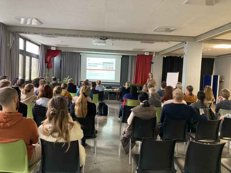 Wenn man während ihres Vortrags über schulische Stressoren, Resilienz und Schutzfaktoren einen Blick durch den Raum gehen ließ, konnte man sehen, dass Frau Prinz mit dem Gesagten genau ins Schwarze traf: viel zustimmendes Nicken, ab und an ein Schmunzeln, wer sich ertappt fühlte, Getuschel mit dem Sitznachbarn über das eigene Verhalten. So bot sich bereits während des Vortrags für jede/n Einzelne/n die Gelegenheit, in sich zu gehen, die eigenen Stressoren und Gewohnheiten zu beleuchten. Bei der anschließenden Kaffeepause war deutlich der Bedarf nach dem Austausch mit den Kollegen zu spüren. Gestärkt stand anschließend das OHG im Zentrum der Betrachtung: Was bedeutet Gesundheitsförderung hin zur gesunden Schule für uns? Dazu wurden Strukturen und Elemente unseres schulischen Alltags auf die Probe gestellt: Welche gesundheitsfördernden Schätze haben wir, wo sehen wir Ansatzpunkte und Optimierungsbedarf? Was ist gesundheitsschädlich für uns, liegt aber gar nicht in unserer Hand? Das Ergebnis der Bestandsaufnahme war ermutigend: Es gibt vieles, was wir an unserer Schule bereits zum Wohle unserer Gesundheit tun und viele Ansatzpunkte, wo wir anpacken können.
