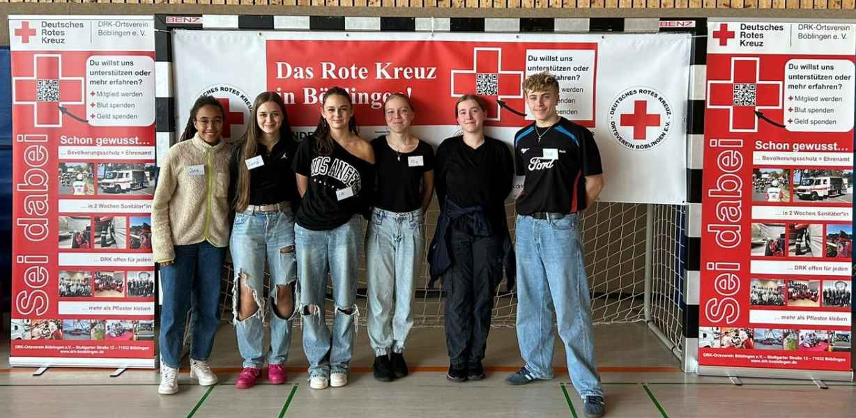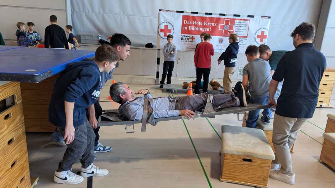 Aus der Schulsanitätsdienst-AG: Im Herbst 2024 gab es eine besondere Erste-Hilfe-Aktion für die siebten Klassen. Das Deutsche Rote Kreuz Böblingen feierte sein 100-jähriges Jubiläum und bot den Schüler*innen an verschiedenen Stationen die Gelegenheit, wichtige Themen der Ersten Hilfe kennenzulernen und selbst praktische Übungen durchzuführen. Von der stabilen Seitenlage über Krankentransport bis hin zum Defibrillator durften die Klassen erfahren, was es bedeutet, Ersthelfer zu sein. Das Ziel bestand darin, allen Teilnehmenden zu zeigen, wie einfach Erste Hilfe sein kann und wie wichtig es ist, im Notfall schnell zu handeln. Alle waren mit Eifer dabei und sogar Lehrkräfte und Schulleitung wurden mit Krankenliegen sicher durch den Parcours gebracht. Diese Aktion hatte das OHG seinem ehemaligen Schüler und Schulsanitäter Dominik Urbanek zu verdanken, der sich als Kreisjungendleiter in Böblingen engagiert. Der Schulsanitätsdienst des OHG und die Auszubildenden der Firma Moog unterstützten den Ortsverein Böblingen mit vollem Einsatz bei diesem besonderen Projekt. Schön zu sehen war, wie sich die schuleigenen Sanitäter nahtlos und geradezu professionell zwischen die routinierten Experten einreihten. Seit dem Schuljahr 2021/2022 gibt es auch am OHG einen Schulsanitätsdienst. Egal ob während der Unterrichtszeit, in den Pausen oder bei größeren Schulveranstaltungen, unsere Schulsanitäter sind jederzeit einsatzbereit und stellen die Erstversorgung am OHG sicher. Dank dieser Veranstaltung dürften weitere Siebtklässler der wertvollen Arbeit des Deutschen Roten Kreuzes nähergekommen sein. Für eine sichere Schule. Für ein vertrauensvolles Miteinander. Gemeinschaft ist unsere Stärke!